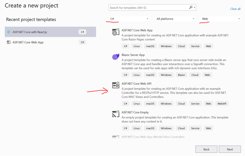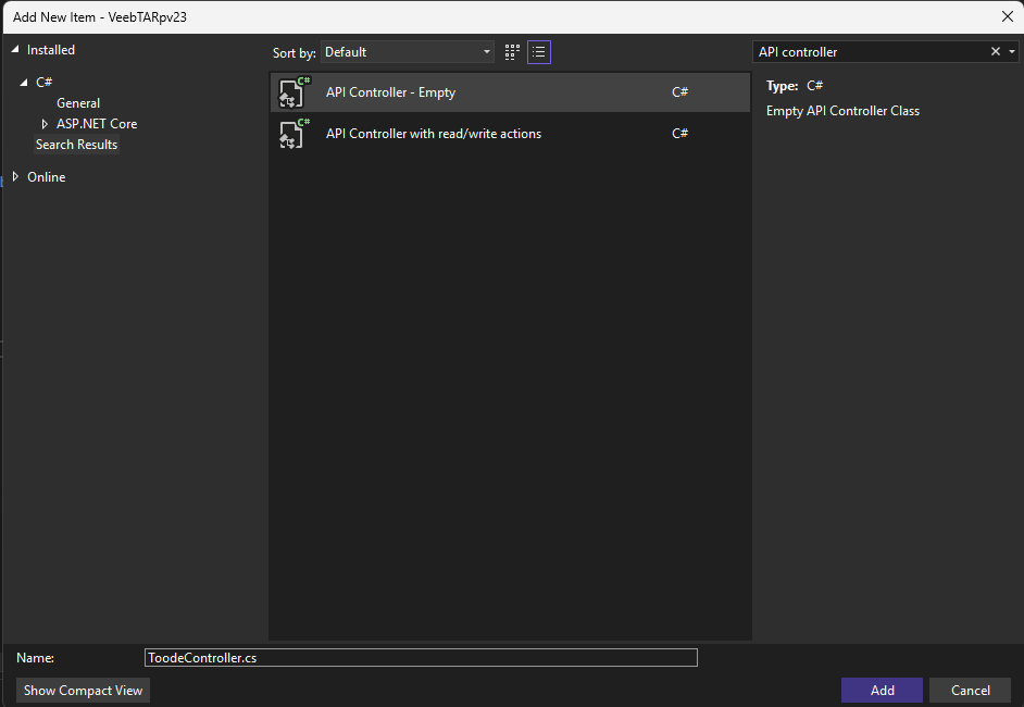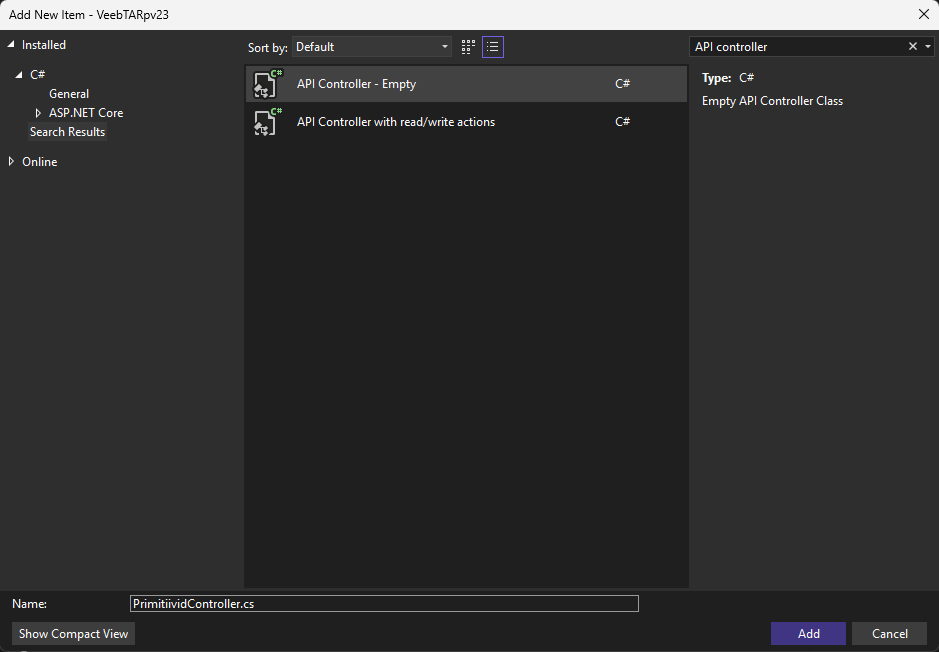 Uue faili loomiseks vajuta kausta “Controllers” kausta peal parema klõpsuga, vali “add” ning võta “New Item…”. Pane loodud faili nimeks PrimitiividController.cs ning vali tühja API kontrolleri mall (API Controller – Empty).