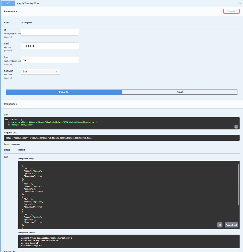 [HttpGet("lisa")] // GET /tooted/lisa?id=1&nimi=Koola&hind=1.5&aktiivne=true